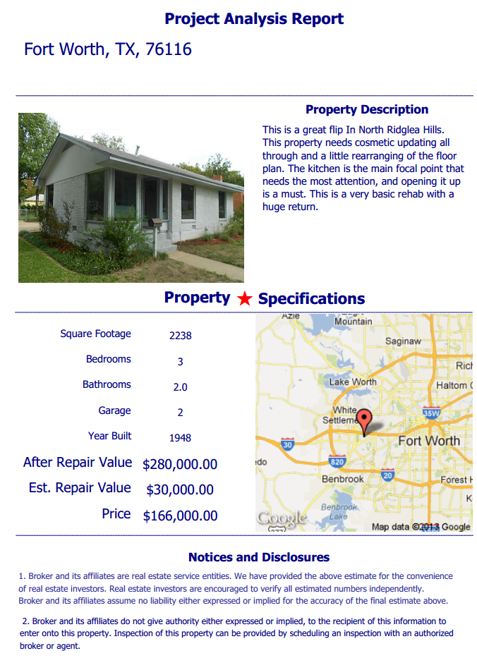 This is a great flip In North Ridglea Hills. This property needs cosmetic updating all through and a little rearranging of the floor plan. The kitchen is the main focal point that needs the most attention, and opening it up is a must. This is a very basic rehab with a huge return.